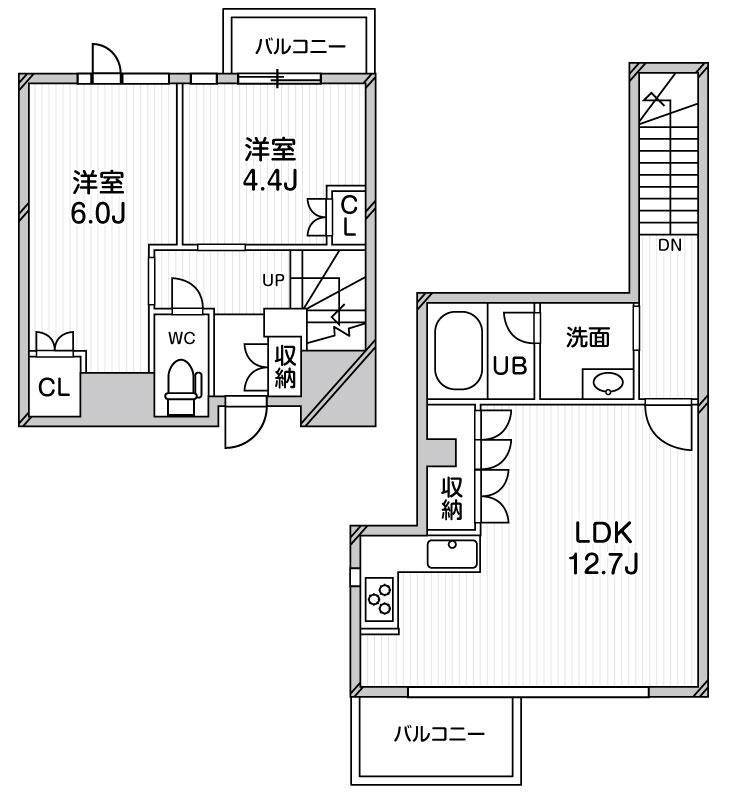 | 間取り詳細 | LDK 12.7畳 、 洋室 6畳 、 洋室 4.4畳 |